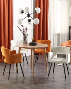 Refresh your dining area with this set of chairs. Made out of durable and low-maintenance synthetic material, they’re a perfect addition to any kitchen or living room, as they can be cleaned easily and quickly. The wide seat, high back and armrests ensure comfortable seating, and metal legs guarantee the stability of the whole construction. Due to their minimalist design, they can be placed in various settings and decor styles, starting from modern and contemporary all the way to retro and vintage-inspired rooms.
